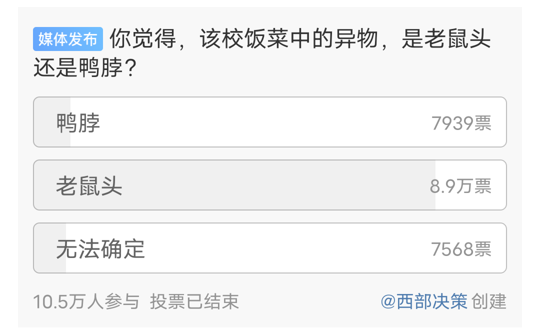 大量網(wǎng)民質(zhì)疑當(dāng)?shù)叵嚓P(guān)部門“指鼠為鴨”。據(jù)“@西部決策”發(fā)起的一項(xiàng)超10萬人參與的微博投票顯示,近九成網(wǎng)民認(rèn)為食堂中的異物為“鼠頭”,不少科普博主、微博大V還有媒體均就此事發(fā)表評論,輿論場基調(diào)以追問和批評為主。6月6日上午,微博話題“#長牙的鴨脖令人如鯁在喉#”沖上熱搜榜第一位。另據(jù)《河南商報(bào)》報(bào)道,有網(wǎng)民爆料該校一教職工疑似要求學(xué)生針對此事進(jìn)行“控評”。輿論場上,除了批評校方說謊、隱瞞等聲音之外,還有網(wǎng)民疑惑市場監(jiān)管部門為何替學(xué)?!罢九_”,猜測背后存在利益輸送等問題;也有網(wǎng)民拍攝視頻解釋稱,鴨脖在某個(gè)角度看起來很像老鼠頭;更多網(wǎng)民呼吁當(dāng)?shù)乇O(jiān)管部門拿出更多檢測證據(jù)來。