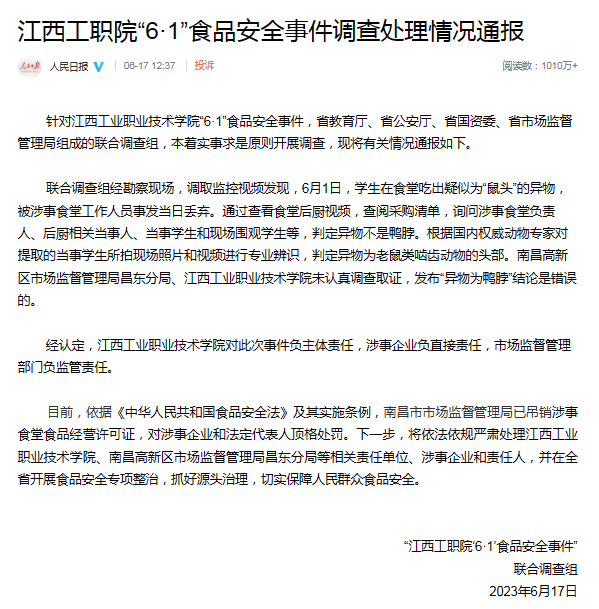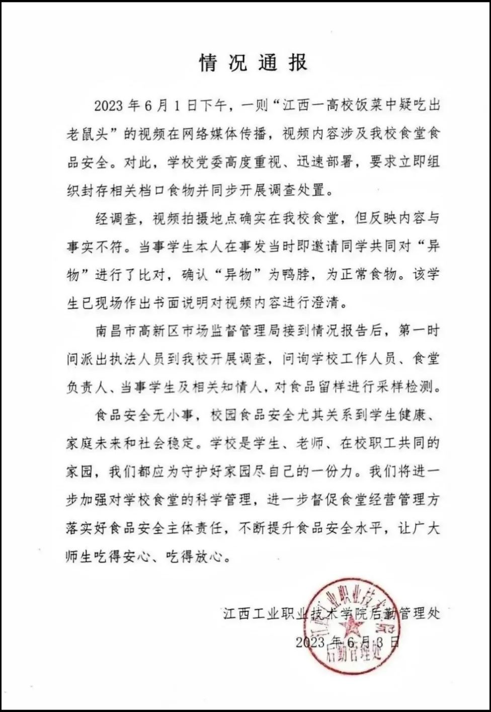 6月2日,據(jù)“@沸點(diǎn)視頻”稱,6月1日,網(wǎng)曝江西工業(yè)職業(yè)技術(shù)學(xué)院學(xué)生吃飯吃出來老鼠頭。據(jù)抖音短視頻顯示,一男子告知食堂工作人員吃出來老鼠頭,工作人員表示“是鴨肉”。報(bào)道稱,涉事的學(xué)校餐飲公司南昌市菁禾餐飲工作人員表示“已經(jīng)看到視頻了,會去調(diào)查核實(shí)處理”。隨后“@頭條新聞”等賬號轉(zhuǎn)載該新聞,部分網(wǎng)民留言評論表示“不信”,并調(diào)侃稱“說是鴨肉的那個(gè)讓他吃掉”。