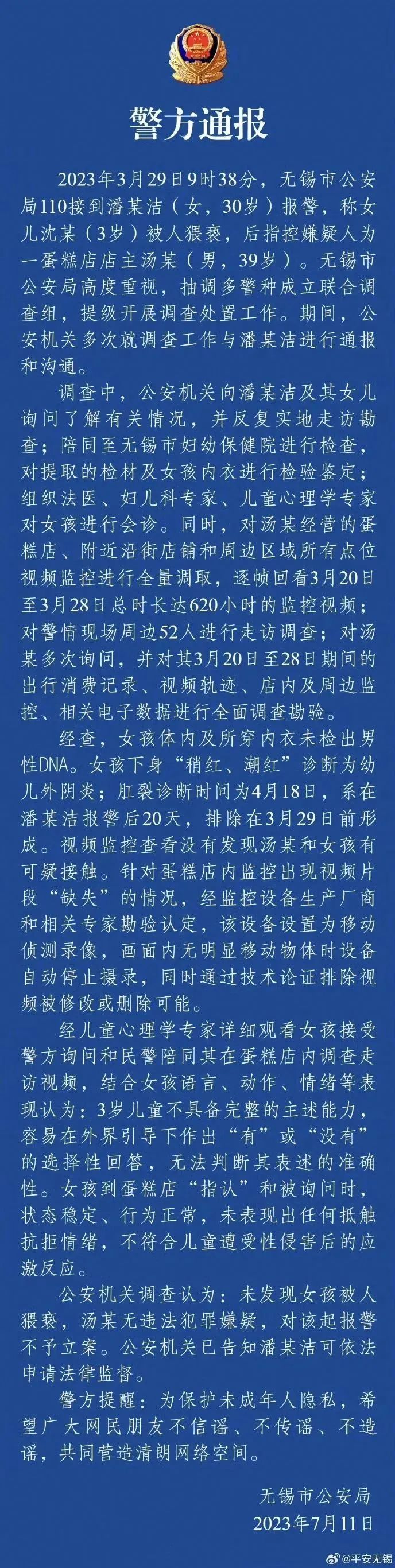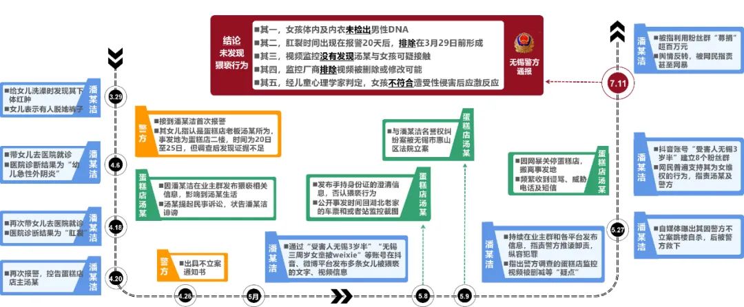 面對巨大的輿情壓力,7月11日,無錫市公安局發(fā)布通報,詳述調(diào)查過程,包括DNA檢測、肛裂原因排除、視頻監(jiān)控核查、心理學(xué)家判定等內(nèi)容。通報全文800余字,邏輯清晰、內(nèi)容詳實,“不存在猥褻行為”這一結(jié)論獲得輿論認可,“#警方通報無錫3歲女童事件調(diào)查結(jié)果#”等微博話題閱讀量累計近6億。至此,輿情反轉(zhuǎn),多數(shù)網(wǎng)民指責(zé)潘某潔虛構(gòu)事實、利用女兒造謠污蔑,呼吁依法對其嚴懲。