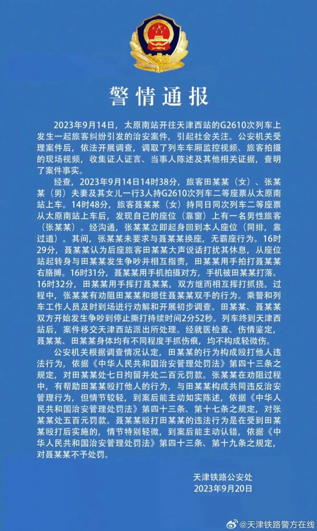數(shù)日后,事件迎來(lái)動(dòng)態(tài)進(jìn)展。9月20日,天津鐵路公安處再次發(fā)布詳細(xì)通報(bào),還原了事發(fā)過(guò)程,表示雙方矛盾系因口角糾紛引發(fā),不存在霸座行為,雙方均不構(gòu)成輕微傷,田某某有毆打他人違法行為,將其拘留七日并罰款200元,張某某勸阻過(guò)程中幫助田某某毆打他人,被處以500元罰款,聶某某的毆打行為是在受到田某某毆打后實(shí)施的,因情節(jié)特別輕微且主動(dòng)認(rèn)錯(cuò)不予處罰。網(wǎng)民認(rèn)可通報(bào)內(nèi)容,稱“原來(lái)如此”,贊官方處理得當(dāng)。