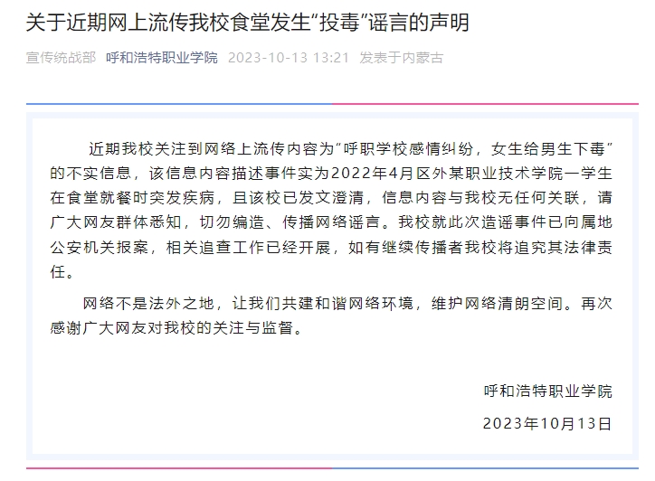 【典型案例】自10月初,連續(xù)有網民在社交媒體發(fā)視頻稱,呼和浩特職業(yè)學院發(fā)生悲劇,一名男生因感情糾紛被女生下毒致死,引發(fā)社會關注。10月13日,該校發(fā)布了一份聲明,澄清這條信息不實,與學校無任何關聯。據悉,網絡流傳的視頻中描述的事件實為2022年4月江蘇南京交通職業(yè)技術學院一學生在食堂就餐時突發(fā)疾病 ,并非因為女生下毒。而且,江蘇南京交通職業(yè)技術學院在當時就已經發(fā)布了相關澄清。再如,10月18日,網傳江蘇南京有男子在酒吧外性侵一名醉酒女子。當日,事發(fā)地所屬南京市警方相關工作人員回應稱,警方已查清此事,沒有性侵,網傳情況有夸大成分。另據警方透露,某社交網站流傳的不實消息,“是專門的AI軟件寫的”。