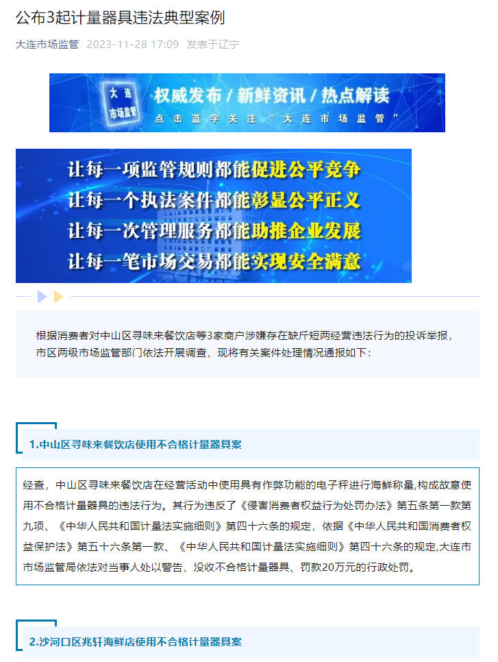 11月28日,微信公眾號(hào)“大連市場(chǎng)監(jiān)管”發(fā)布情況通報(bào)稱,根據(jù)消費(fèi)者對(duì)3家商戶涉嫌缺斤短兩經(jīng)營(yíng)的投訴舉報(bào),市區(qū)兩級(jí)市場(chǎng)監(jiān)管部門依法開(kāi)展調(diào)查,現(xiàn)將對(duì)中山區(qū)尋味來(lái)餐飲店、沙河口區(qū)福之源生鮮超市、沙河口區(qū)兆軒海鮮店分別處以20萬(wàn)元、10萬(wàn)元、10萬(wàn)元的行政處罰,警告并沒(méi)收不合格計(jì)量器具。