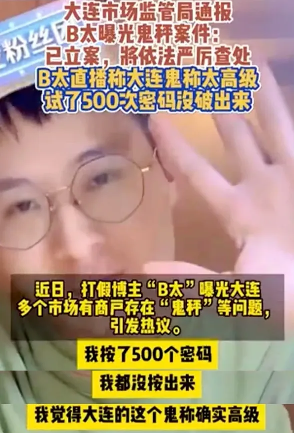 11月9日,“B太”發(fā)布實(shí)測(cè)海鮮加工餐廳的視頻,稱其到訪的3家海鮮加工商家均疑似在秤上做了手腳。“B太”嘗試破解商家使用的“鬼秤”密碼時(shí),被商家推搡,還遭威脅“把眼鏡給你砸了”;其撥打市場(chǎng)監(jiān)管局電話后,等待一個(gè)半小時(shí)仍無(wú)人到場(chǎng),直到“B太”開(kāi)啟直播,工作人員才姍姍來(lái)遲。“B太”出示相關(guān)視頻證據(jù),經(jīng)檢查該商家的電子秤雖然有強(qiáng)檢合格證,但沒(méi)有鉛封。而當(dāng)“鬼秤”被帶到市場(chǎng)監(jiān)管局時(shí),專業(yè)檢測(cè)人員只對(duì)“問(wèn)題電子秤”進(jìn)行簡(jiǎn)單檢測(cè)后就宣布該秤“無(wú)問(wèn)題”。當(dāng)“B太”提出對(duì)電子秤進(jìn)行密碼破譯時(shí),檢測(cè)人員表示“我也跟著學(xué)習(xí)學(xué)習(xí)”,但“B太”嘗試了500多個(gè)密碼都未破解成功。次日,該電子秤被送往無(wú)錫檢測(cè)。“B太”在微博和抖音平臺(tái)發(fā)布相關(guān)視頻,播放量迅速破億次,多數(shù)網(wǎng)民指責(zé)店家有恃無(wú)恐,質(zhì)疑市場(chǎng)監(jiān)管部門消極怠工;部分計(jì)劃去大連旅游的網(wǎng)民還表示,因擔(dān)心被“坑”將臨時(shí)改變目的地。