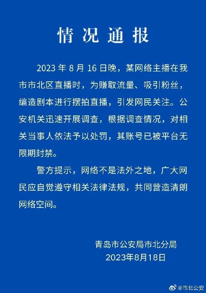 8月18日,青島市公安局市北分局微博賬號“@市北公安”通報(bào)稱,某網(wǎng)絡(luò)主播在青島市市北區(qū)直播時(shí),為賺取流量、吸引粉絲,編造劇本進(jìn)行擺拍直播。公安機(jī)關(guān)對相關(guān)當(dāng)事人依法予以處罰,其賬號已被平臺無限期封禁?!?二驢#”“#警方通報(bào)網(wǎng)傳二驢直播被綁架#”等多個(gè)話題閱讀量近6.7億。輿論對此結(jié)果表示認(rèn)同,評論稱“山東警方果斷調(diào)查處置,結(jié)果大快人心”。