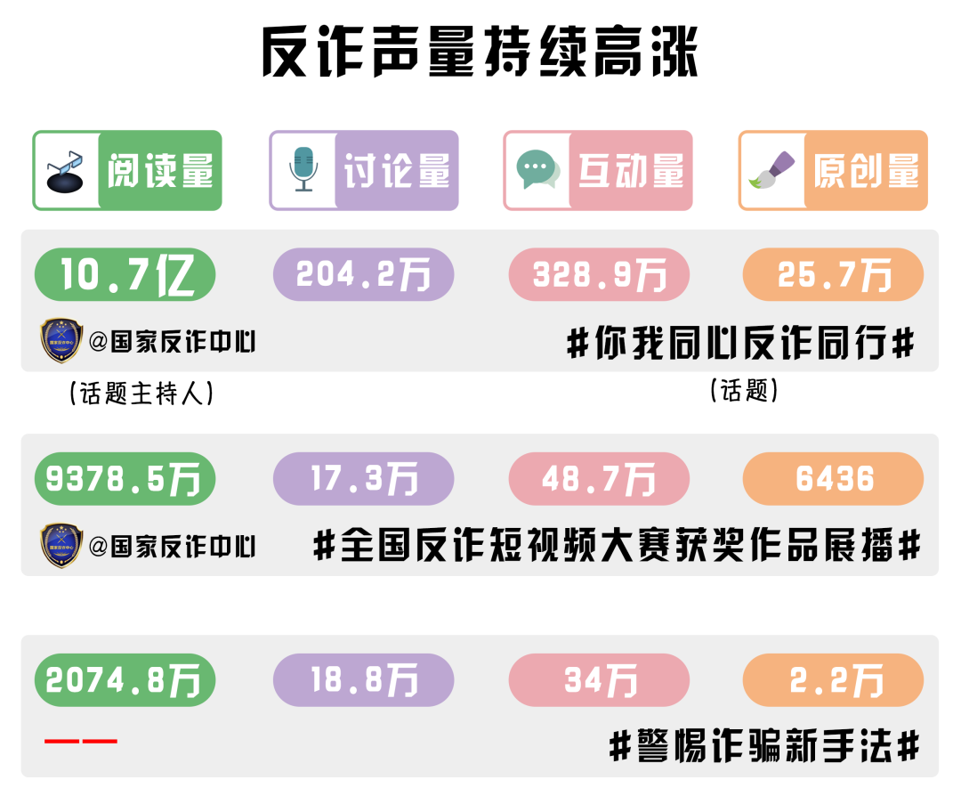 從微博數(shù)據(jù)來(lái)看,#你我同心反詐同行# #全國(guó)反詐短視頻大賽獲獎(jiǎng)作品展播# #警惕詐騙新手法#等微博話(huà)題累計(jì)閱讀量超11.8億,輿論反響熱烈,反詐聲量持續(xù)高漲。