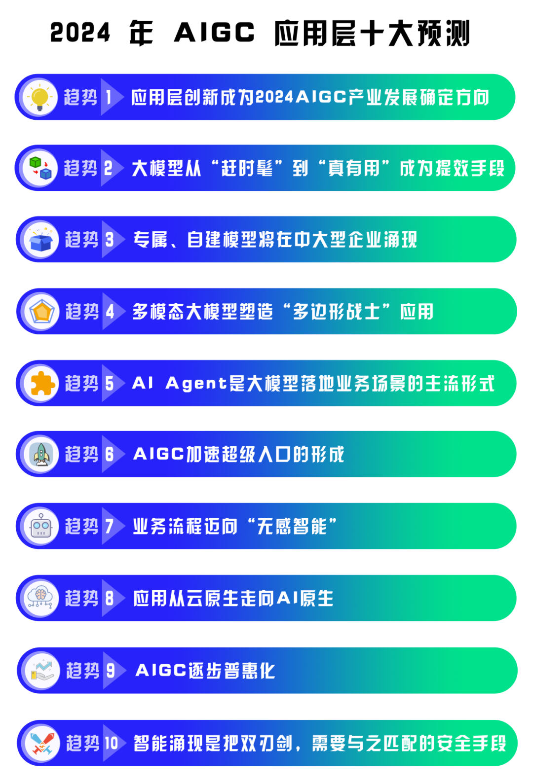 《2024 AIGC應(yīng)用層十大趨勢(shì)白皮書》中列舉了2024年生成式人工智能應(yīng)用層十大預(yù)測(cè),除了對(duì)生成式人工智能產(chǎn)業(yè)發(fā)展及應(yīng)用場(chǎng)景的預(yù)測(cè)外,還提到了“智能涌現(xiàn)是把雙刃劍,需要與之匹配的安全措施”。