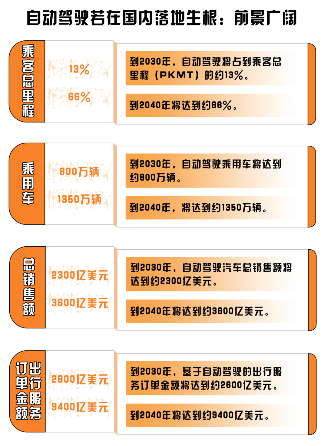 “冰凍三尺非一日之寒,水滴石穿非一日之功”。無人駕駛作為自動駕駛的高級階段,其能夠在國內(nèi)爆火“出圈”絕非偶然。咨詢公司麥肯錫預(yù)計,我國未來很可能成為全球最大的自動駕駛市場,至2030年,自動駕駛相關(guān)的新車銷售及出行服務(wù)創(chuàng)收將超過5000億美元,自動駕駛市場優(yōu)化擴張,為無人駕駛在國內(nèi)發(fā)展打下堅實基礎(chǔ)。