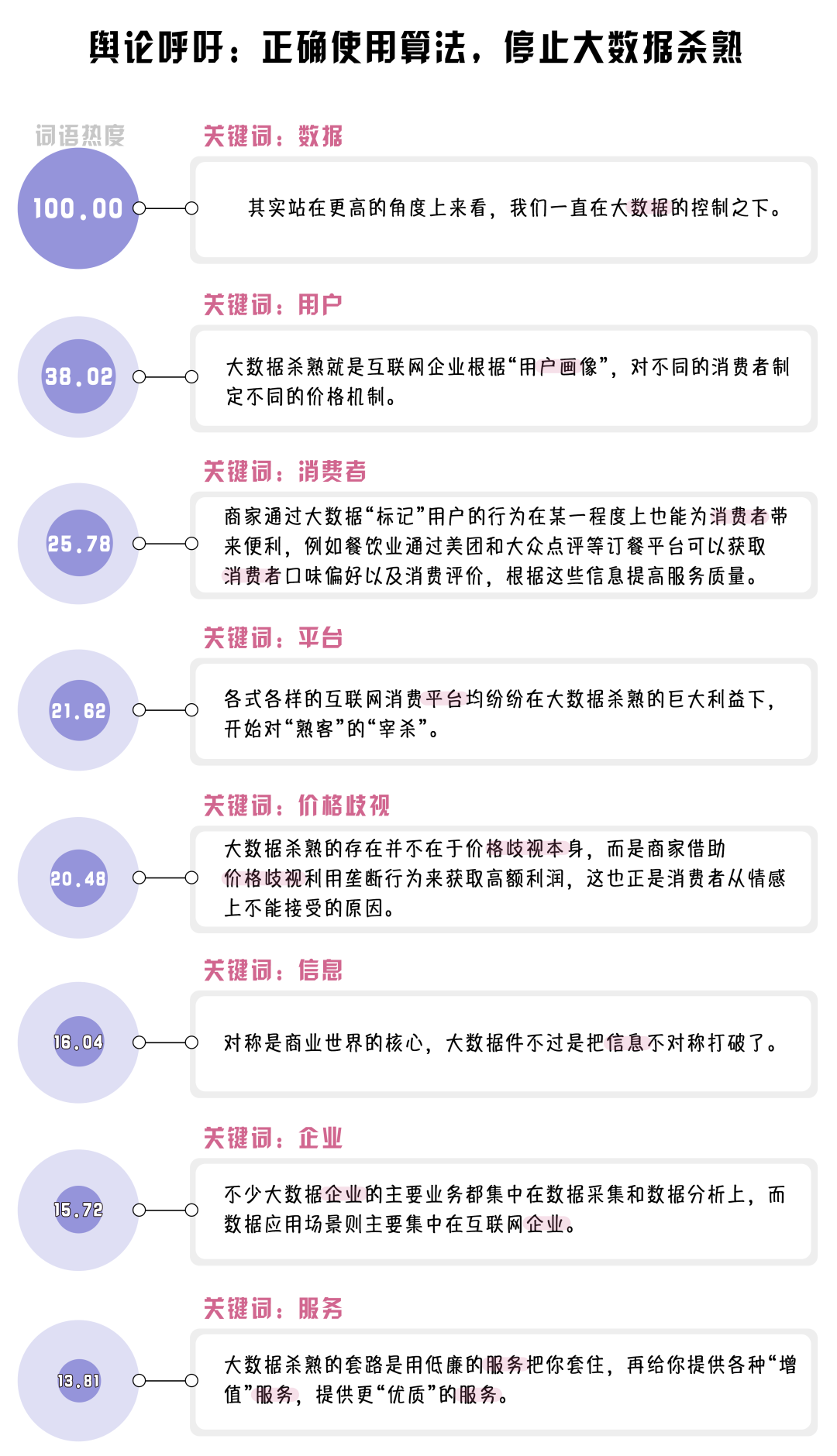 (制作:法治網(wǎng)輿情中心 數(shù)據(jù)來源:選取知乎問題“如何評價(jià)大數(shù)據(jù)殺熟這一現(xiàn)象?”下的1090個(gè)回答,對選取的回答進(jìn)行數(shù)據(jù)清洗及自然語言處理,將熱度最高的詞語規(guī)定為100)