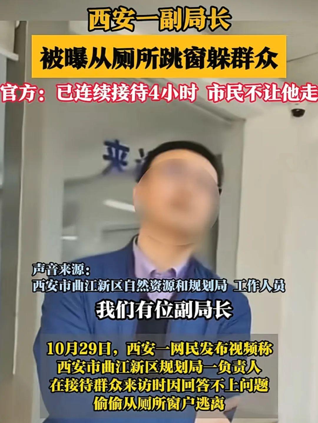 10月28日,一則“官員跳窗逃跑”的視頻在網(wǎng)絡(luò)傳播。視頻顯示,多名群眾將一名身著藍(lán)色上衣的男子圍住,疑似就房屋拆遷問(wèn)題進(jìn)行爭(zhēng)執(zhí)。圍觀群眾有的拍桌子,有的大聲呼喊,稱“今天不給個(gè)說(shuō)法,誰(shuí)也別想離開這里”等,隨后該男子從廁所跳窗逃走。10月29日,大皖新聞、《瀟湘晨報(bào)》等多家媒體報(bào)道此事。據(jù)爆料的西安市民反映,其上訪是因?yàn)樽约杭腋浇诓疬w,當(dāng)?shù)鼐用癜l(fā)現(xiàn)政府部門最新規(guī)劃的地理位置與最初承諾的不一樣,且距離高壓線過(guò)近。當(dāng)日下午,西安市曲江新區(qū)自然資源和規(guī)劃局工作人員通過(guò)媒體回應(yīng)稱,視頻人物是該局一名副局長(zhǎng),其從九點(diǎn)多到下午一點(diǎn)多一直在接訪,但市民不讓其離開,無(wú)奈之下從窗戶離開。針對(duì)群眾反映的情況,該局也在研究高壓線設(shè)備的遷移問(wèn)題,后續(xù)將進(jìn)一步加強(qiáng)與征遷市民的溝通交流,爭(zhēng)取妥善處理。10月30日下午,“@封面新聞”報(bào)道稱,針對(duì)工作人員在接訪期間的不當(dāng)行為,曲江新區(qū)黨工委、管委會(huì)高度重視,已安排紀(jì)檢監(jiān)察機(jī)關(guān)聯(lián)合相關(guān)部門啟動(dòng)調(diào)查程序。當(dāng)?shù)毓俜降目焖偬幹糜行Ь徍洼浨?,但事件帶?lái)的討論為公職人員和政府部門應(yīng)對(duì)網(wǎng)絡(luò)輿情提供思路和借鑒。