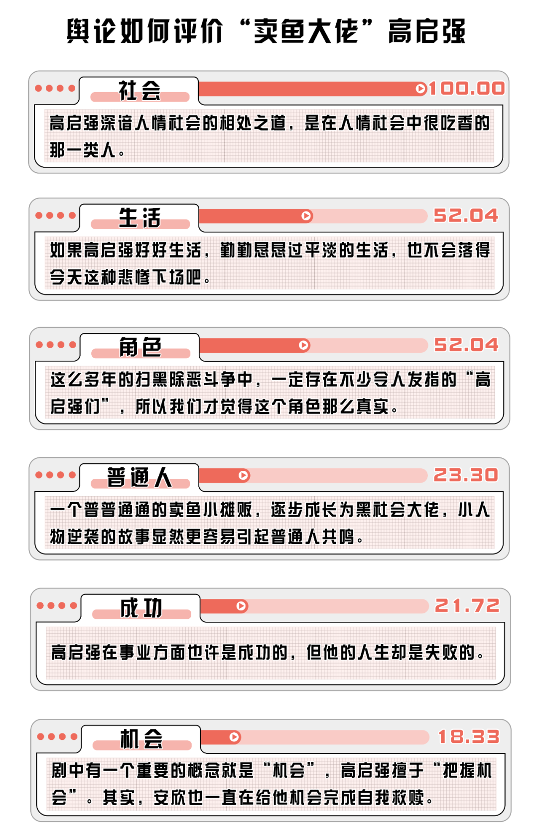 綜合輿論來看,有網民表示,掃黑除惡斗爭中,一定存在不少目無法紀的“高啟強”們,所以觀眾才會覺得這個角色如此真實,“高啟強”們作惡多端,理應受到法律的制裁;還有網民表示,在人情社會的大環(huán)境下,高啟強正是因為善于把握機會,才實現了身份轉變,但如果把犯罪作為通往成功的“登云梯”,那么結局一定是悲慘的;還有網民表示,高啟強的成功是“罪惡的成功”,其身上散發(fā)的魅力是“惡之魅力”,如果利用“小人物逆襲”的故事鼓吹反派角色的“悲情魅力”,則極易模糊正義與邪惡的界限。