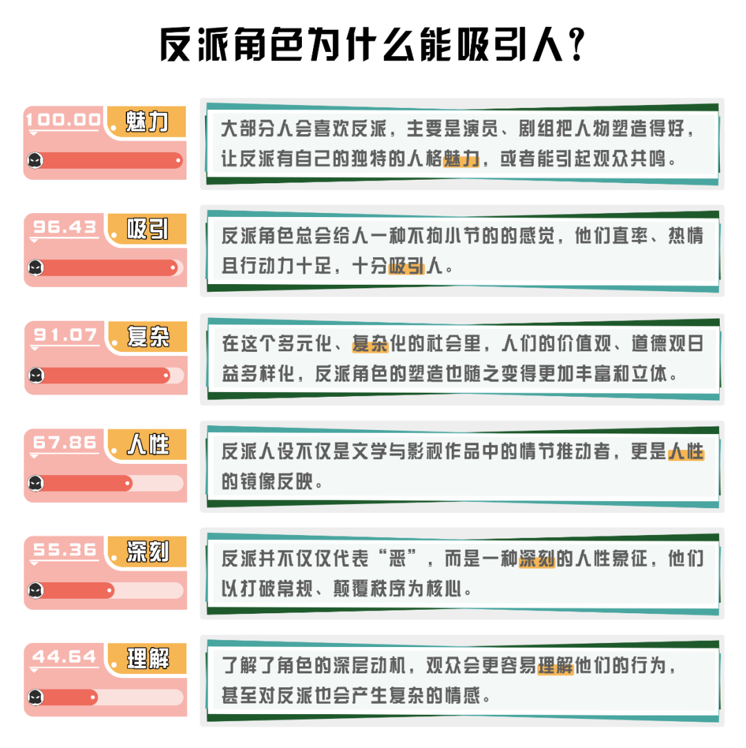 在小紅書平臺,搜集“為什么反派角色更吸引人?”相關貼文,整理分析后發(fā)現,演員出色的演技是刻畫反派角色的基礎。令觀眾著迷的,往往是反派角色身上的多面性,反派角色的“惡”并不僅僅是字面意思,它是一種復雜的、深刻的人性象征,更像是一道令人捉摸不透的難解謎題。