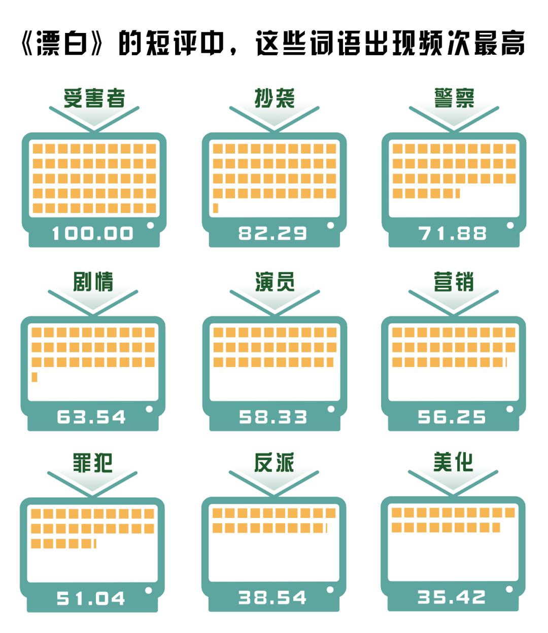 (制作:法治網輿情中心 數據來源:選取400條《漂白》豆瓣短評,對短評做分詞及歸一化處理,進行分詞后將熱度最高的詞語規(guī)定為100)