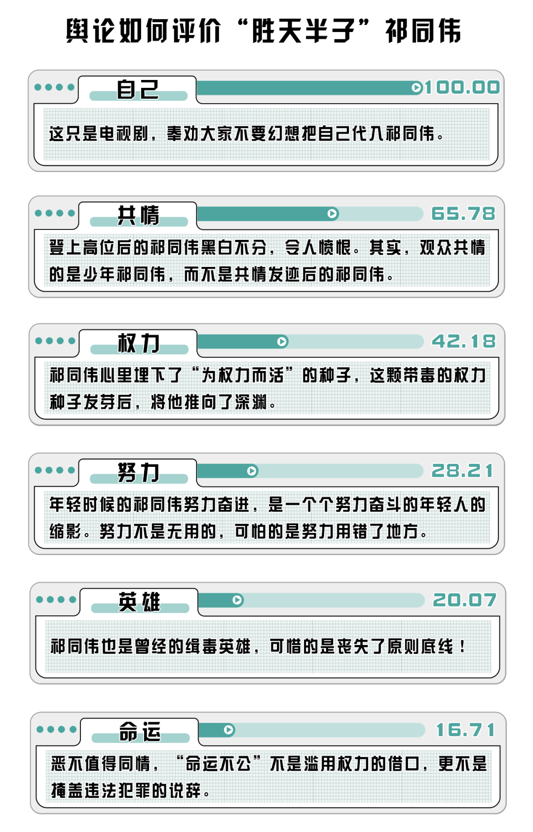 (制作:法治網輿情中心 數據來源:收集知乎問題“為什么有那么多人會共情《人民的名義》中的祁同偉”下的920個回答,對選取的回答進行數據清洗及自然語言處理,將熱度最高的詞語規(guī)定為100,并舉例子)