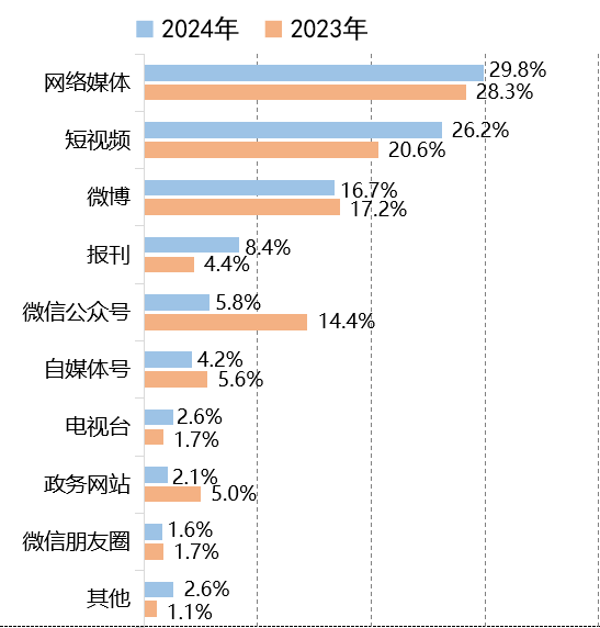 2024年,網(wǎng)絡媒體、短視頻、微博穩(wěn)居政法輿情發(fā)酵的主陣地,相關平臺產(chǎn)生的輿情數(shù)量占比累計72.7%。報刊、電視臺等專業(yè)性較強的傳統(tǒng)媒體仍占一席之地,由此發(fā)酵的輿情數(shù)量比重均有增長。相比之下,源于微博、微信公眾號與政務網(wǎng)站的輿情數(shù)量有所減少。