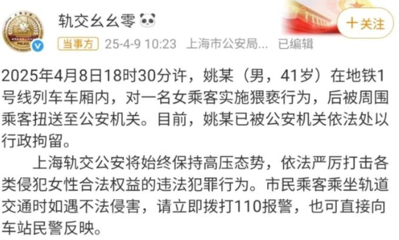 4月9日上午,多段網(wǎng)傳視頻引發(fā)關注,視頻顯示,上海地鐵一名女乘客疑似被猥褻,對身邊男子哭喊道“你把褲子脫了并弄到我身上”,同車女子稱“姐妹,我錄了視頻,我陪你去”?!癅荔枝新聞”等媒體跟進報道,上海地鐵客服工作人員稱確有其事,網(wǎng)民痛斥男子“變態(tài)”“垃圾”。當日10時23分,上海市公安局城市軌道和公交分局官微“@軌交幺幺零”發(fā)通報稱,“4月8日18時30分許,姚某在地鐵1號線列車車廂內,對一名女乘客實施猥褻行為,被周圍乘客扭送至公安機關。目前,姚某已被公安機關依法處以行政拘留”。多數(shù)網(wǎng)民稱贊警方行動快速;部分網(wǎng)民表示不滿,認為行政拘留處罰較輕。4月10日,男子所在的工作單位發(fā)布公告,宣布將其開除。