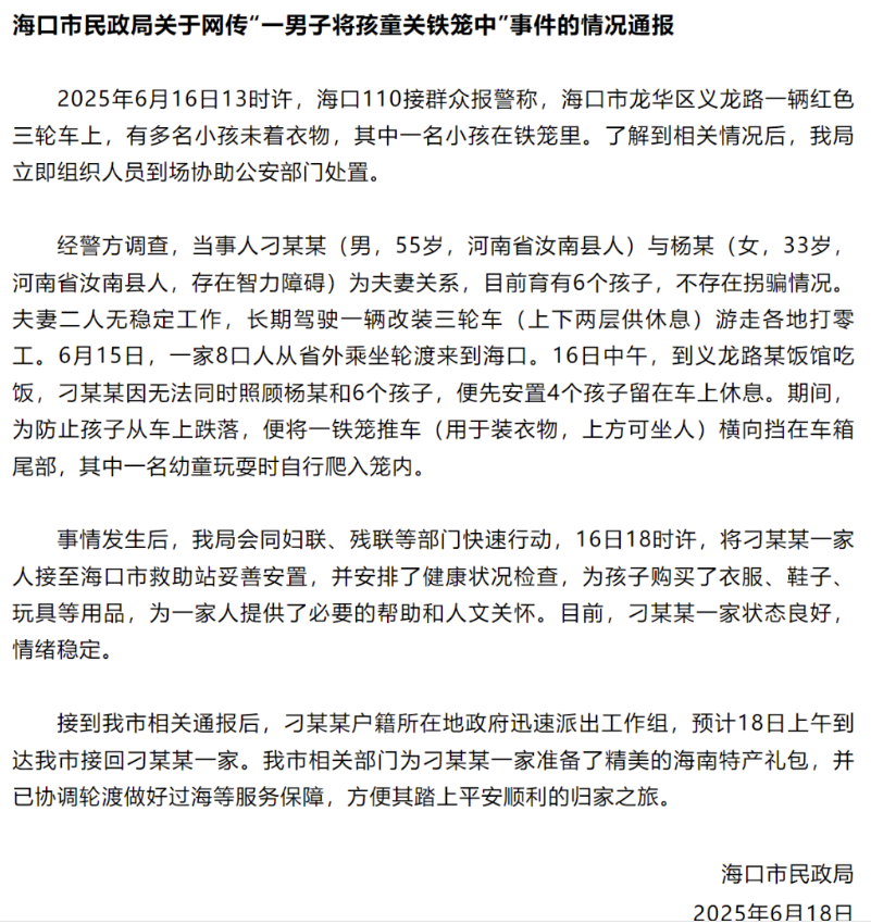 海口市民政局關(guān)于網(wǎng)傳“一男子將孩童關(guān)鐵籠中”事件的情況通報(bào)