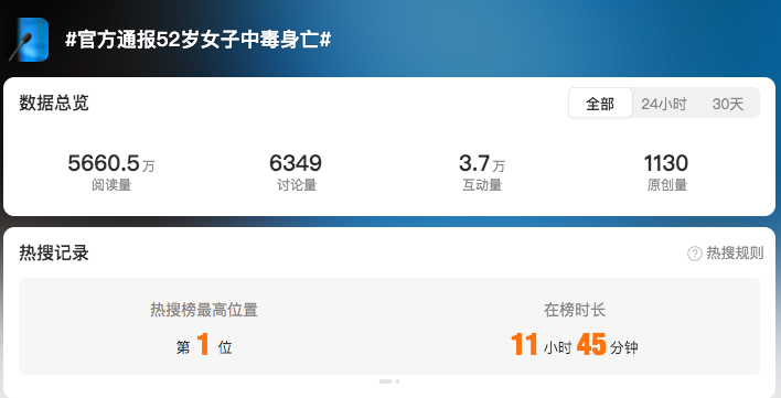 9月15日,浙江省杭州市余杭區(qū)閑林街道辦事處發(fā)布情況通報(bào)稱,9月9日,涂某某(女,52歲)在進(jìn)入閑林中路附近空地時(shí),不慎接觸廢棄氫氟酸中毒,送醫(yī)后經(jīng)搶救無(wú)效于2025年9月14日凌晨不幸身亡。公安機(jī)關(guān)在接警后第一時(shí)間介入調(diào)查;生態(tài)環(huán)境部門已按規(guī)范完成現(xiàn)場(chǎng)無(wú)害化處置;街道正在全力推進(jìn)善后處置工作。目前,事發(fā)原因正在進(jìn)一步調(diào)查中。當(dāng)晚“官方通報(bào)52歲女子中毒身亡”登上熱搜榜第一位,閱讀量迅速破千萬(wàn)。