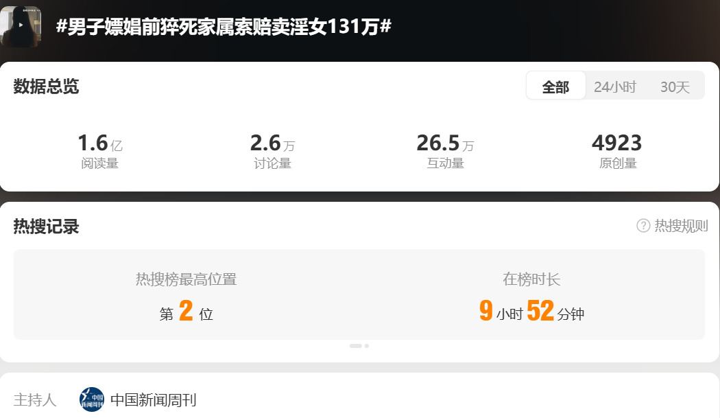此案被報(bào)道后,“@中國(guó)新聞周刊”、上觀新聞、封面新聞等媒體接力傳播,推高輿情熱度,微博話題“#男子嫖娼前猝死家屬索賠賣(mài)淫女131萬(wàn)#”登上熱搜榜第2位。