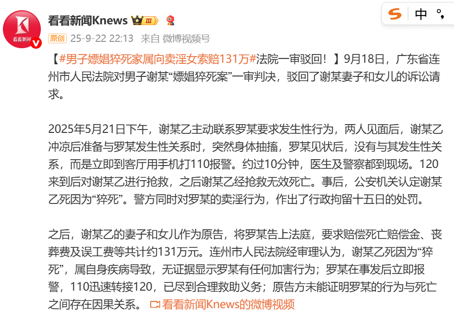 9月22日,據(jù)上海電視臺(tái)“@看看新聞Knews”消息,9月18日,廣東省連州市人民法院對(duì)男子謝某“嫖娼猝死案”作出一審判決。裁判文書(shū)網(wǎng)顯示,5月21日,謝某主動(dòng)聯(lián)系羅某要求發(fā)生性行為,兩人見(jiàn)面后,謝某沖涼后準(zhǔn)備發(fā)生性關(guān)系時(shí)突然身體抽搐,羅某見(jiàn)狀后,立即到客廳撥打110報(bào)警。醫(yī)護(hù)人員趕到后對(duì)謝某進(jìn)行搶救,謝某經(jīng)搶救無(wú)效死亡。警方認(rèn)定謝某死因?yàn)椤扳馈?,?duì)羅某的賣(mài)淫行為,作出行政拘留十五日的處罰。事后,謝某的妻子和女兒將羅某告上法庭,要求賠償死亡賠償金、喪葬費(fèi)及誤工費(fèi)等共計(jì)約131萬(wàn)元。連州市人民法院經(jīng)審理認(rèn)為,謝某死因?yàn)椤扳馈?,屬自身疾病?dǎo)致,無(wú)證據(jù)顯示羅某有任何加害行為;羅某在事發(fā)后當(dāng)即報(bào)警并配合120搶救,已盡到合理救助義務(wù);原告方未能證明羅某的行為與死亡之間存在因果關(guān)系。據(jù)此,該法院駁回謝某妻子和女兒的全部訴訟請(qǐng)求。