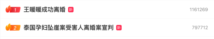 截至10月12日20時(shí),全網(wǎng)信息總量12萬余條,“#王暖暖獲離婚賠償50萬#”“#泰國孕婦墜崖案受害人離婚案宣判#”“#王暖暖成功離婚#”等全平臺(tái)相關(guān)話題閱讀量累計(jì)14.6億次。