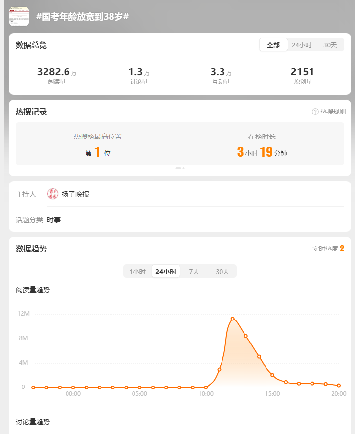 隨后,該公告內(nèi)容被新華社、北京日報、揚子晚報、極目新聞等多家媒體報道,迅速引發(fā)輿論關(guān)注。微博話題“#國考年齡放寬到38歲#”迅速登上熱搜榜最高位置。