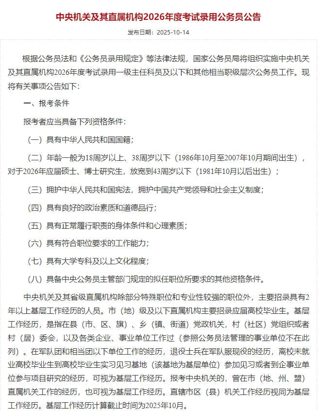 10月14日,國家公務(wù)員局網(wǎng)站發(fā)布《中央機關(guān)及其直屬機構(gòu)2026年度考試錄用公務(wù)員公告》,公告顯示報考條件:年齡一般為18周歲以上、38周歲以下(1986年10月至2007年10月期間出生),對于2026年應(yīng)屆碩士、博士研究生,放寬到43周歲以下(1981年10月以后出生)。這意味著,國家公務(wù)員報考者年齡放寬至38周歲以下,打破過去35周歲上限。此外,對于應(yīng)屆生碩士、博士研究生,年齡更是放寬至43周歲以下。