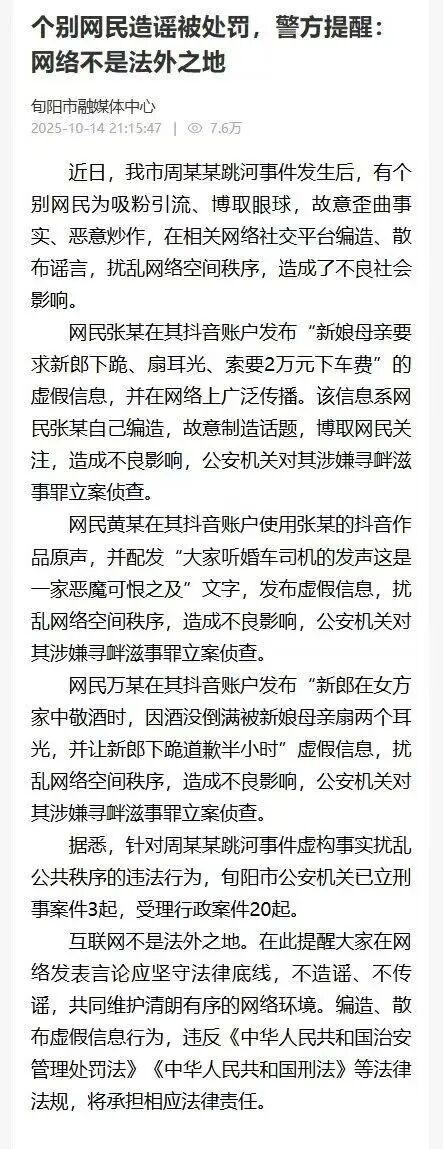 同日,陜西安康旬陽(yáng)市融媒體中心發(fā)布消息稱,近日,旬陽(yáng)市周某某跳河事件發(fā)生后,有個(gè)別網(wǎng)民為吸粉引流、博取眼球,故意歪曲事實(shí)、惡意炒作,在相關(guān)網(wǎng)絡(luò)社交平臺(tái)編造、散布謠言,擾亂網(wǎng)絡(luò)空間秩序,造成了不良社會(huì)影響。網(wǎng)民張某、黃某、萬(wàn)某在短視頻賬戶發(fā)布相關(guān)虛假信息,造成不良影響,已被公安機(jī)關(guān)以涉嫌尋釁滋事罪立案?jìng)刹?。針?duì)周某某跳河事件虛構(gòu)事實(shí)擾亂公共秩序的違法行為,旬陽(yáng)市公安機(jī)關(guān)已立刑事案件3起,受理行政案件20起。輿論普遍表示,官方展現(xiàn)了治理謠言的決心,認(rèn)為制止謠言最好的方法就是公布調(diào)查結(jié)果。