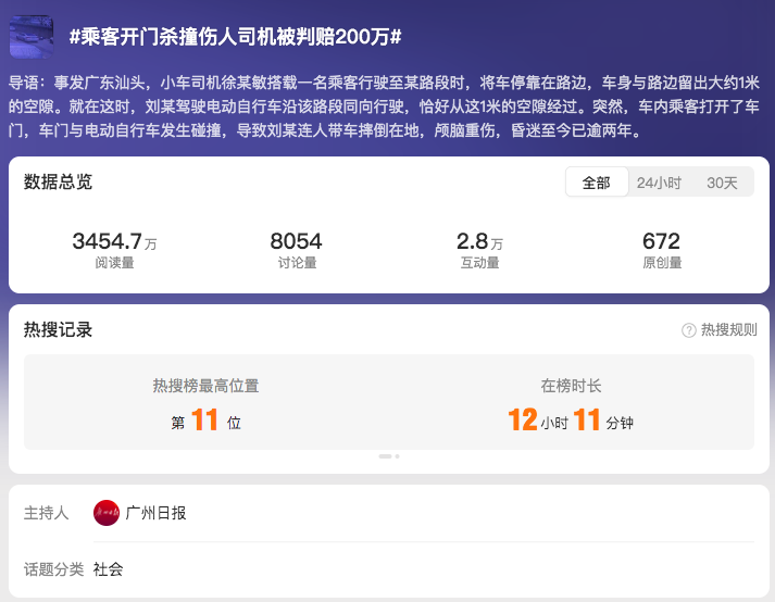此案被報道后,環(huán)球網、上觀新聞、《廣州日報》等媒體接力傳播,推高輿情熱度,微博話題“#乘客開門殺撞傷人司機被判賠200萬#”登上熱搜榜第11位。