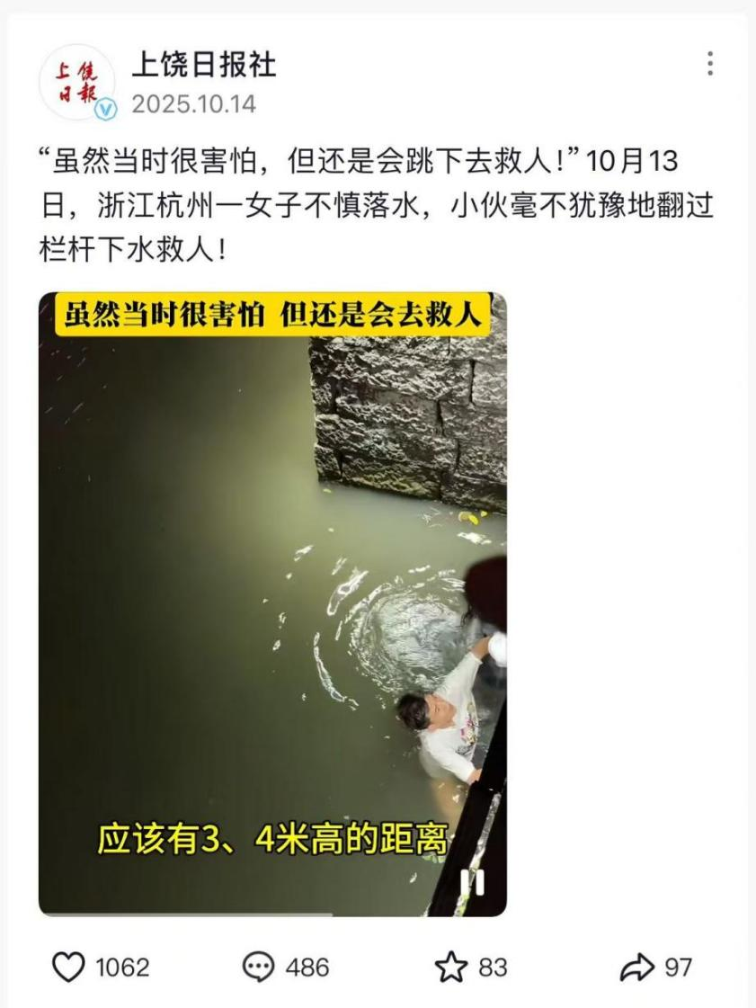 10月14日,“上饒日報社”抖音賬號報道稱,10月13日,浙江杭州一女子不慎落水,小伙毫不猶豫地翻過欄桿下水救人,并配發(fā)救人視頻。該視頻引起部分網(wǎng)民關(guān)注,多數(shù)網(wǎng)民為男子救人行為點贊。