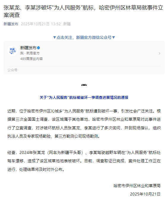 10月21日,新疆維吾爾自治區(qū)新聞辦公室官方微信號“新疆發(fā)布”發(fā)布通報,稱哈密市伊州區(qū)林業(yè)和草原局對此事件進行了立案調(diào)查,對涉破壞航標人員張某龍(網(wǎng)名為“新疆平頭哥”)、李某進行了多次詢問,并到現(xiàn)場指認處理結果將及時對外公布。人民日報、澎湃新聞、紅星新聞等轉(zhuǎn)發(fā)了通報內(nèi)容,輿情有所回溫。