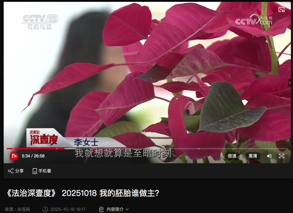 10月18日,央視社會(huì)與法頻道《法治深壹度》節(jié)目播發(fā)專(zhuān)題報(bào)道《我的胚胎誰(shuí)做主?》,報(bào)道一起喪偶婦女輔助生殖權(quán)益案。據(jù)介紹,福建李女士在丈夫不幸去世后,希望利用夫妻二人在醫(yī)院冷凍保存的胚胎繼續(xù)實(shí)施移植手術(shù),但醫(yī)院鑒于醫(yī)學(xué)倫理問(wèn)題拒絕了她的請(qǐng)求。隨后李女士將醫(yī)院起訴至法院,一審和二審均被駁回。直至2022年6月,福建省高級(jí)人民法院再審認(rèn)為,李女士要求醫(yī)院為其實(shí)施胚胎移植手術(shù)生育二胎有充分的法律依據(jù),并且還能在精神上撫慰雙方的老人,最終判決醫(yī)院繼續(xù)履行合同,為李女士實(shí)施胚胎移植手術(shù)。該報(bào)道采訪到李女士本人、醫(yī)院代理律師、法學(xué)專(zhuān)家及法官,全面回顧李女士個(gè)人遭遇、情感動(dòng)機(jī)以及案件背后的法理爭(zhēng)議。