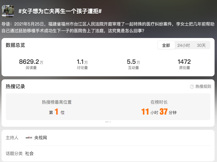 10月28日晚,“@央視網(wǎng)”官方微博發(fā)出26分鐘的報(bào)道視頻,摘取報(bào)道引言?xún)?nèi)容,并設(shè)置“#女子用亡夫胚胎求試管二胎遭拒#”“#女子想為亡夫再生一個(gè)孩子遭拒#”話題,將該案引入輿論視野,引發(fā)網(wǎng)民討論。后續(xù)不斷有“南方都市報(bào)”“新浪新聞”“生活幫”等媒體短視頻賬號(hào)發(fā)布該報(bào)道切片視頻,關(guān)注度隨之升溫。10月29日,微博話題“#女子用亡夫胚胎求試管二胎遭拒#”沖上熱搜榜第1位。