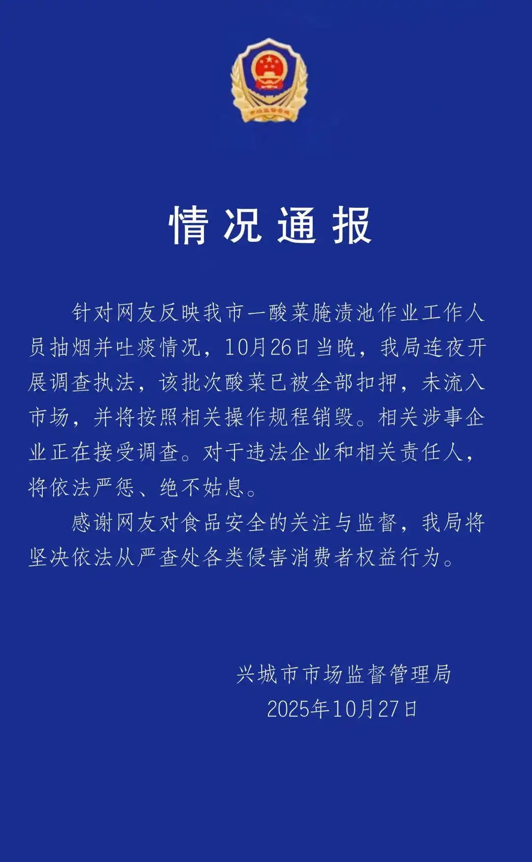 10月27日,遼寧省興城市市場監(jiān)督管理局通過微信公眾號(hào)“興城市市場監(jiān)督管理局”發(fā)布情況通報(bào)稱,針對(duì)網(wǎng)友反映的情況,10月26日當(dāng)晚,該局連夜開展調(diào)查執(zhí)法,該批次酸菜已被全部扣押,未流入市場,并將按照相關(guān)操作規(guī)程銷毀。涉事企業(yè)正在接受調(diào)查。對(duì)于違法企業(yè)和相關(guān)責(zé)任人,將依法嚴(yán)懲、絕不姑息。隨后,中國新聞網(wǎng)、光明網(wǎng)、觀察者網(wǎng)等媒體轉(zhuǎn)發(fā)報(bào)道。