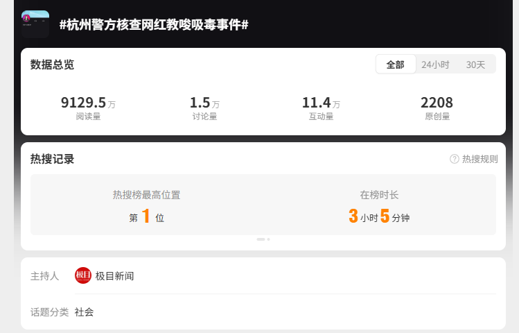 截至11月9日20時(shí),相關(guān)信息量2.5萬(wàn)余條,微博話題“#杭州警方核查網(wǎng)紅教唆吸毒事件#”“#800萬(wàn)粉絲網(wǎng)紅被控訴教唆他人吸毒#”“#被控教唆吸毒800萬(wàn)粉絲網(wǎng)紅被封號(hào)#”等閱讀量累計(jì)超1.5億。