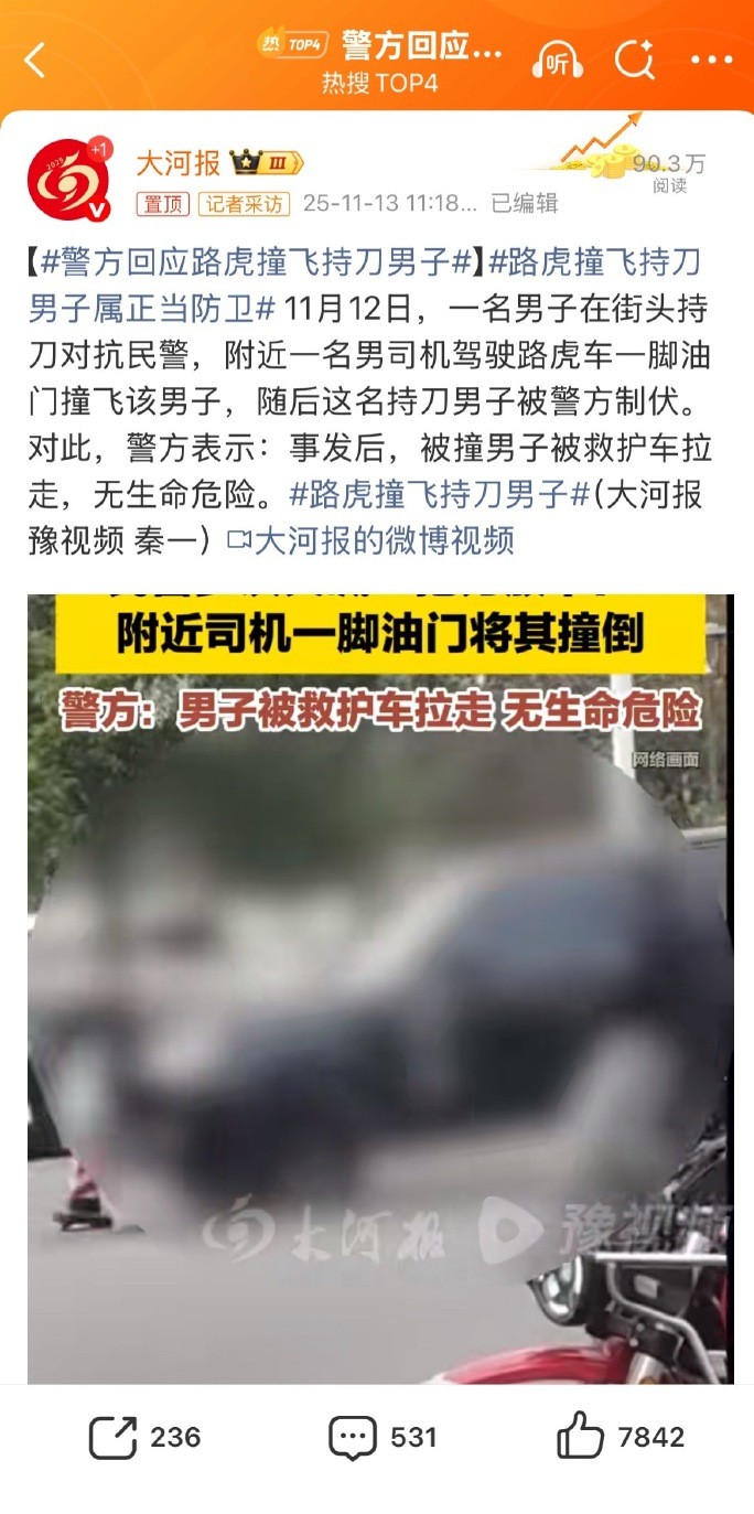 11月12日,多位網(wǎng)民在社交平臺上發(fā)布視頻稱,在河南鄭州某銀行研修中心門前,一男子持刀與民警對峙,并無視警方“把刀放下”的警告,在此緊急情況下,現(xiàn)場一名駕駛黑色路虎越野車的司機先是倒車調(diào)整位置,隨后突然加速將持刀者撞倒在地,幫助民警將持刀者制服。該視頻一經(jīng)傳播,迅速引起網(wǎng)民熱議,多數(shù)網(wǎng)民稱贊司機“有勇有謀”,認(rèn)為其果斷撞擊持刀者是見義勇為;部分網(wǎng)民擔(dān)憂非專業(yè)人士直接介入此類高危事件可能引發(fā)不可控的風(fēng)險;另有網(wǎng)民期待官方公布事發(fā)真相。