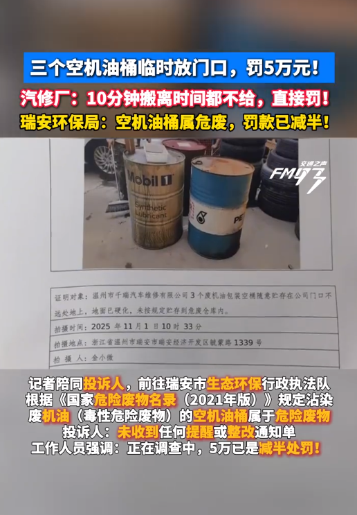 11月4日,據(jù)溫州市新聞傳媒中心《溫州晚間報(bào)道》欄目報(bào)道,溫州瑞安一汽修店負(fù)責(zé)人彭先生求助稱,近日因廠里地面做地坪漆,臨時(shí)將三個(gè)空機(jī)油桶挪到門(mén)口,11月1日瑞安市生態(tài)環(huán)保行政執(zhí)法隊(duì)到店檢查,當(dāng)場(chǎng)對(duì)此定性為“隨意擺放危險(xiǎn)廢物”,直接通知要對(duì)該違法行為處罰5萬(wàn)元,執(zhí)法人員稱“簽字認(rèn)罰5萬(wàn)、不簽字則罰10萬(wàn)”。彭先生認(rèn)為處罰過(guò)重,無(wú)法接受。