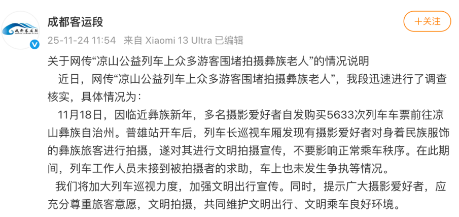 11月24日12時許,“@成都客運段”發(fā)布情況說明稱,因臨近彝族新年,近日多名攝影愛好者乘坐5633次列車前往涼山彝族自治州。普雄站開車后,列車長巡視車廂發(fā)現(xiàn)有攝影愛好者對身著民族服飾的彝族旅客進(jìn)行拍攝,遂對其進(jìn)行文明拍攝宣傳,不要影響正常乘車秩序。在此期間,列車工作人員未接到被拍攝者的求助,車上也未發(fā)生爭執(zhí)等情況。今后將加大列車巡視力度,加強文明出行宣傳。