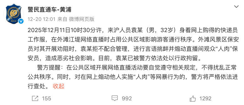 12月20日,上海市公安局黃浦分局官方微博“@警民直通車-黃浦”發(fā)布警方通報(bào)稱,2025年12月11日10時(shí)30分許,來滬人員袁某(男,32歲)身著網(wǎng)上購得的快遞員工作服,在外灘江堤網(wǎng)絡(luò)直播時(shí)占用公共區(qū)域影響游客通行秩序。外灘風(fēng)景區(qū)保安員對其開展勸阻時(shí),袁某拒不配合管理,進(jìn)行言語挑釁并煽動(dòng)直播間觀眾“人肉”保安員,造成惡劣社會(huì)影響。目前,袁某已被警方依法處以行政拘留。