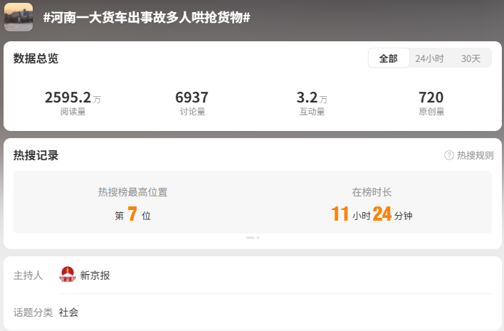 截至12月29日14時,全網(wǎng)相關信息1.2萬余條,“#河南一大貨車出事故多人哄搶貨物#”“#警方介入貨車出事故貨物遭哄搶#”“#貨車事故貨物被哄搶司機嘶吼別搶了#” 等相關微博話題閱讀量累計超3500萬。