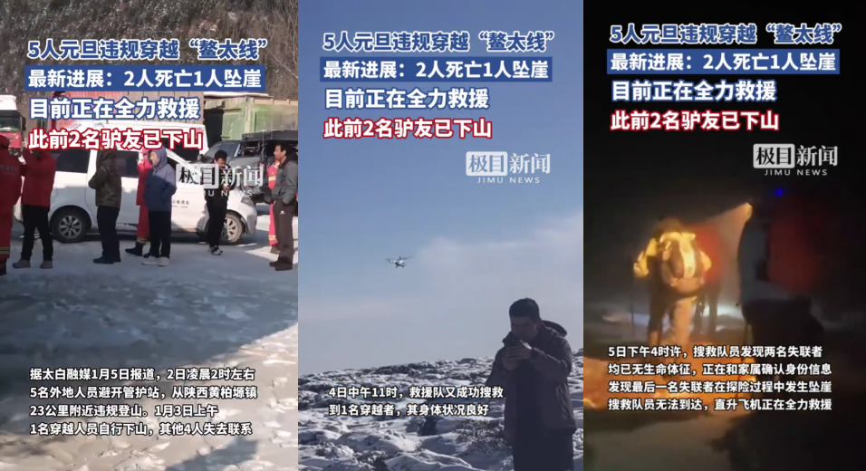 1月3日,有網(wǎng)民發(fā)帖稱“元旦期間5人穿越‘小鰲太線’,4人失聯(lián)”,引發(fā)關(guān)注。1月5日晚,“太白融媒”微信公眾號發(fā)布通報稱,1月2日凌晨2時左右,5名外地人員避開管護(hù)站,從黃柏塬鎮(zhèn)23公里附近違規(guī)登山。1月3日上午,1名穿越人員自行下山,其他4人失去聯(lián)系。當(dāng)?shù)仉S后組織救援人員進(jìn)山全力搜救。1月4日11時,救援隊成功搜救到1人,其身體狀況良好。1月5日下午4時許,救援隊又發(fā)現(xiàn)2名失聯(lián)者,已無生命體征,同時發(fā)現(xiàn)最后1名失聯(lián)者在探險過程中發(fā)生墜崖事故,現(xiàn)場坡陡崖高,搜救隊員無法到達(dá),出動了直升機全力救援。