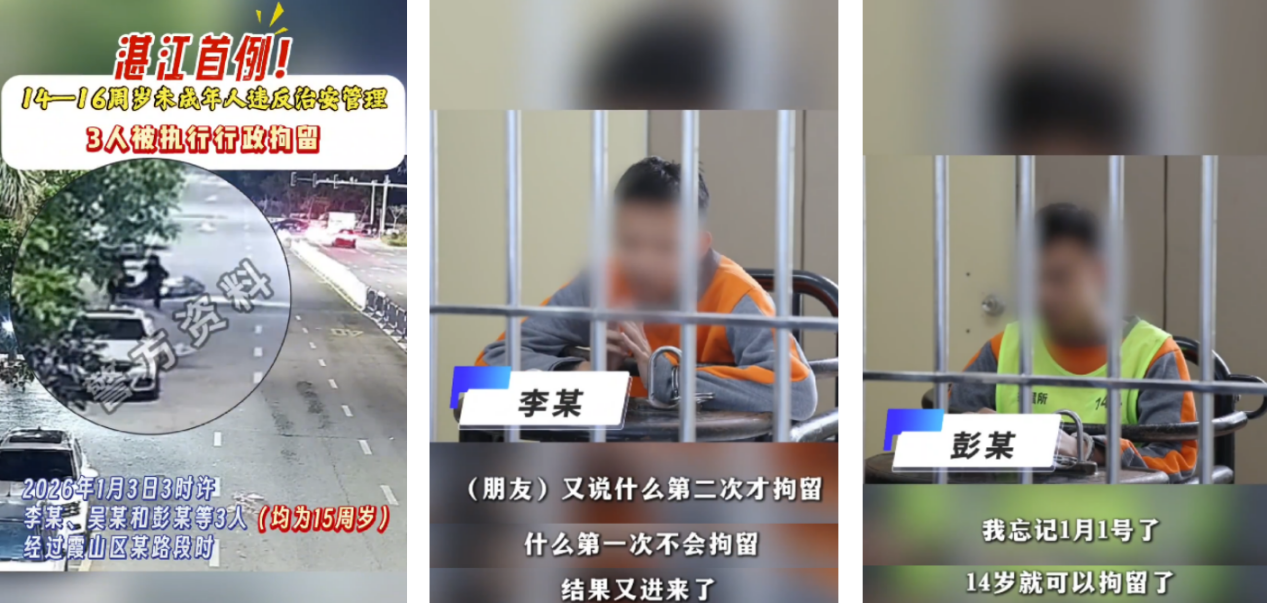 1月8日,《湛江晚報》報道稱,1月3日,廣東湛江3名15歲少年因持械追打他人涉嫌尋釁滋事,被依法行政拘留13天。這是2026年1月1日新修訂的《中華人民共和國治安管理處罰法》施行以來,該市首例對14至16周歲未成年人執(zhí)行行政拘留的案件。