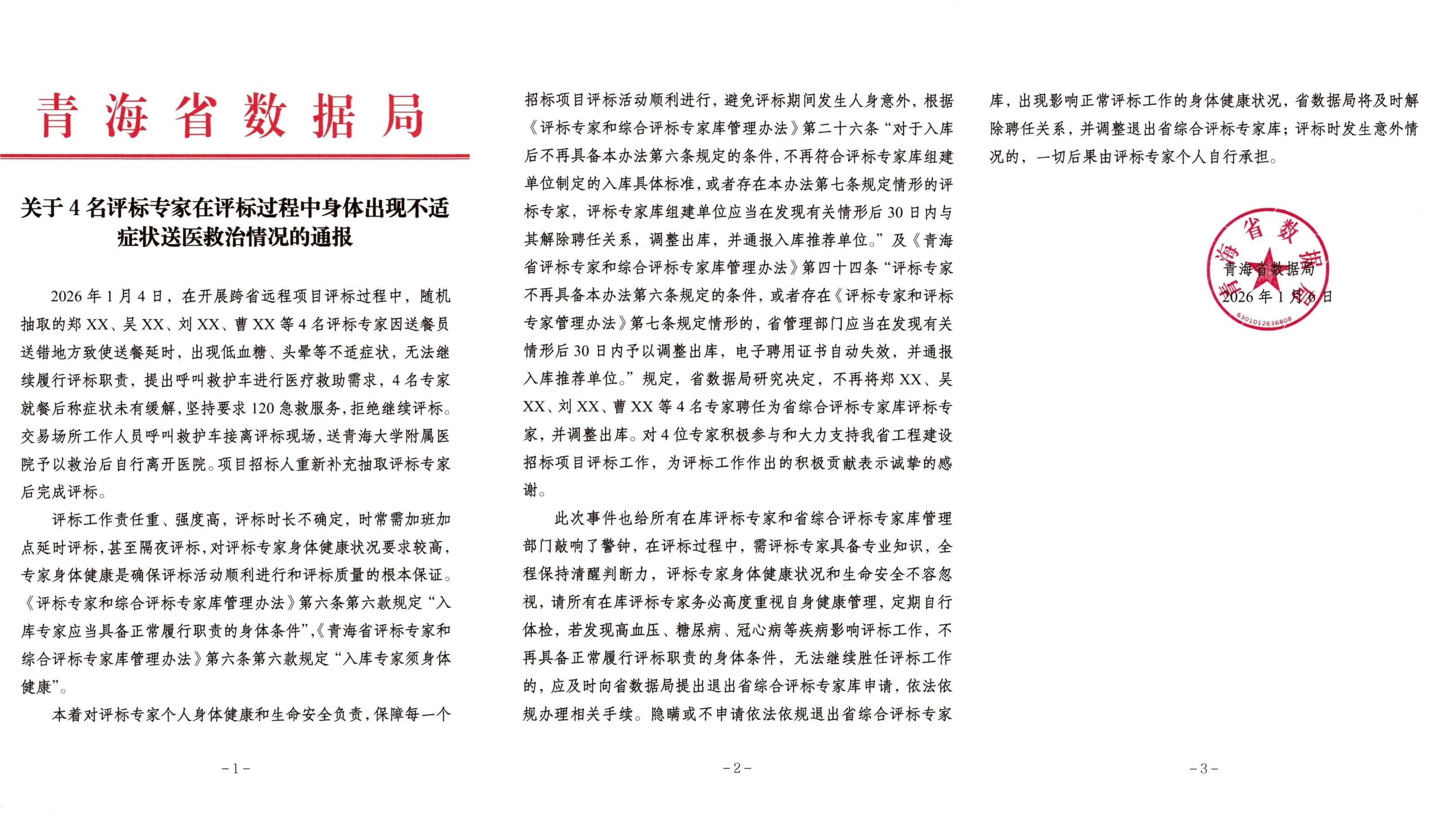 1月7日,青海省數(shù)據(jù)局在青海省公共資源交易網(wǎng)發(fā)布《關(guān)于4名評標專家在評標過程中身體出現(xiàn)不適癥狀送醫(yī)救治情況的通報》。通報稱,1月4日,4名評標專家因送餐延時出現(xiàn)低血糖、頭暈等不適癥狀,無法繼續(xù)履行評標職責,提出呼叫救護車進行醫(yī)療救助需求,4名專家就餐后稱癥狀未有緩解,堅持要求120急救服務,拒絕繼續(xù)評標。此后交易場所工作人員將其送青海大學附屬醫(yī)院救治,項目招標人重新補充抽取評標專家后完成評標。通報表示,省數(shù)據(jù)局研究決定,不再將上述4名專家聘任為省綜合評標專家?guī)煸u標專家,并調(diào)整出庫。