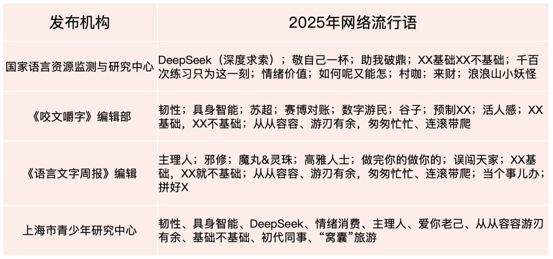 2025年12月,國家語言資源監(jiān)測(cè)與研究中心、《咬文嚼字》編輯部及《語言文字周報(bào)》編輯部相繼發(fā)布年度網(wǎng)絡(luò)流行語榜單。12月25日,上海市青少年研究中心立足青年群體視角,推出了“2025年度青年十大熱詞”。這些入選的流行語涵蓋科技、文化、消費(fèi)等多個(gè)領(lǐng)域,其中“韌性”“DeepSeek”“具身智能”“從從容容游刃有余”等詞匯更是出現(xiàn)在不同機(jī)構(gòu)的榜單上,呈現(xiàn)出高度重合性。它們不僅構(gòu)成了一部由全民共同書寫的“情緒備忘錄”,也折射出當(dāng)前傳播格局的演變與社會(huì)價(jià)值觀念的變遷。法治網(wǎng)輿情中心從使用主體、社會(huì)心態(tài)、傳播邏輯、行為趨向四個(gè)維度,對(duì)2025年網(wǎng)絡(luò)流行語展開深入解讀。