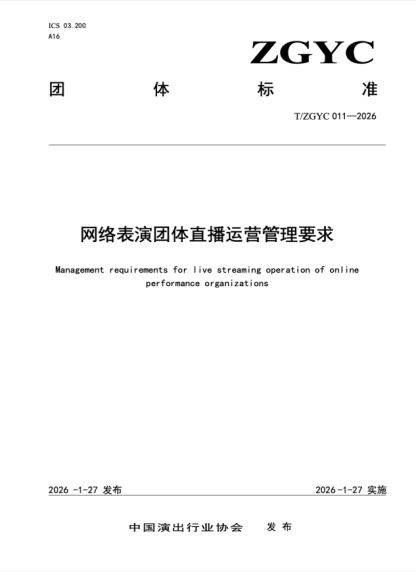 1月27日,中國(guó)演出行業(yè)協(xié)會(huì)正式發(fā)布《網(wǎng)絡(luò)表演團(tuán)體直播運(yùn)營(yíng)管理要求》(T/ZGYC 011—2026)團(tuán)體標(biāo)準(zhǔn)(以下簡(jiǎn)稱標(biāo)準(zhǔn)),抖音、快手、無(wú)憂傳媒等平臺(tái)及MCN機(jī)構(gòu)參與起草。