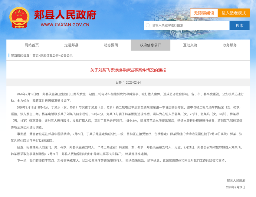 2月21日,郟縣茨芭鎮(zhèn)人民政府發(fā)布首次情況通報(bào),稱警方已對涉事夫妻劉某飛、韓某娜采取刑事強(qiáng)制措施。