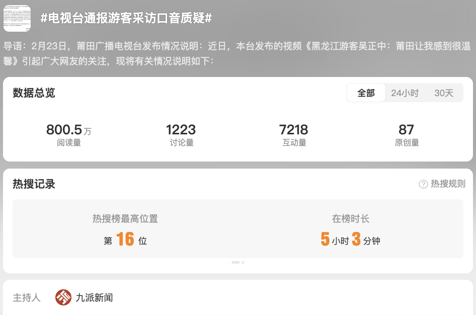 截至2月27日17時(shí),相關(guān)信息量近3萬條,微博話題“#被質(zhì)疑采訪口音游客工作生活在福建#”“#電視臺通報(bào)游客采訪口音質(zhì)疑#”“#被質(zhì)疑口音當(dāng)事游客爺爺為黑龍江人#”“#黑龍江游客張嘴卻是福建口音#”等閱讀量累計(jì)達(dá)1545萬。