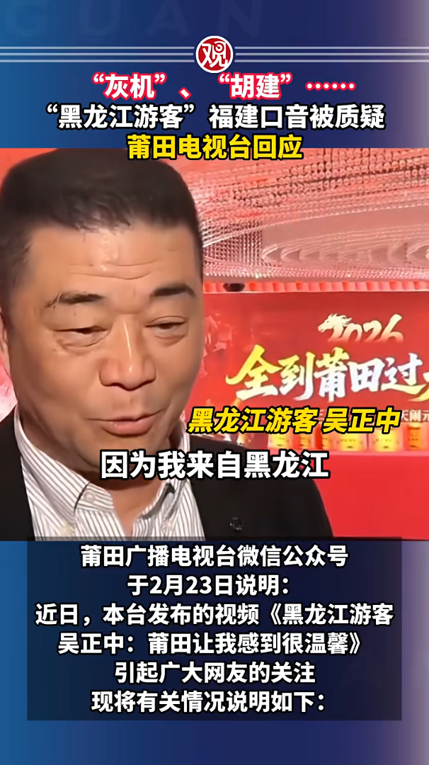2月21日,福建莆田廣播電視臺為宣傳當(dāng)?shù)亍叭狡翁镞^大年”新春文旅活動(dòng),發(fā)布了一則視頻《黑龍江游客吳正中:莆田讓我感到很溫馨》。視頻中吳正中自稱黑龍江游客,稱“專程坐飛機(jī)11小時(shí)來莆田過年”,并盛贊當(dāng)?shù)睾ur和民俗。然而細(xì)心的網(wǎng)民發(fā)現(xiàn)其口音帶有典型的福建方言特征,如將“飛機(jī)”讀作“灰機(jī)”、“福建”讀作“胡建”,對其“東北人”的身份表示懷疑。