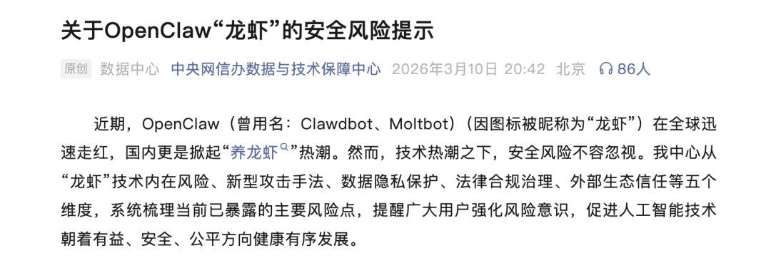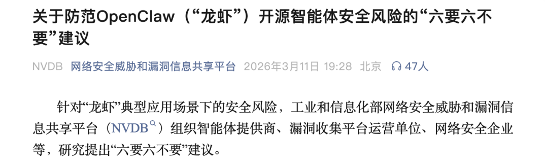 3月10日和11日,中央網(wǎng)信辦、工業(yè)和信息化部先后發(fā)布關(guān)于OpenClaw“龍蝦”的安全風(fēng)險(xiǎn)提示,從“龍蝦”技術(shù)內(nèi)在風(fēng)險(xiǎn)、新型攻擊手法、數(shù)據(jù)隱私保護(hù)、法律合規(guī)治理、外部生態(tài)信任等維度,系統(tǒng)梳理當(dāng)前已暴露的主要風(fēng)險(xiǎn)點(diǎn),并提出“六要六不要”的規(guī)范指引,提醒用戶強(qiáng)化風(fēng)險(xiǎn)意識(shí),引導(dǎo)人工智能技術(shù)安全、有序、健康發(fā)展。