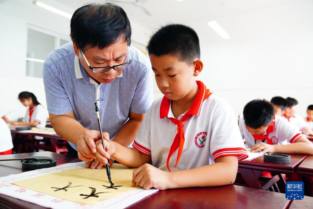 7月28日,在山東省齊河縣祝阿鎮(zhèn)馬坊社區(qū)鄉(xiāng)村“復(fù)興少年宮”,田偉在教小朋友練習(xí)書(shū)法。