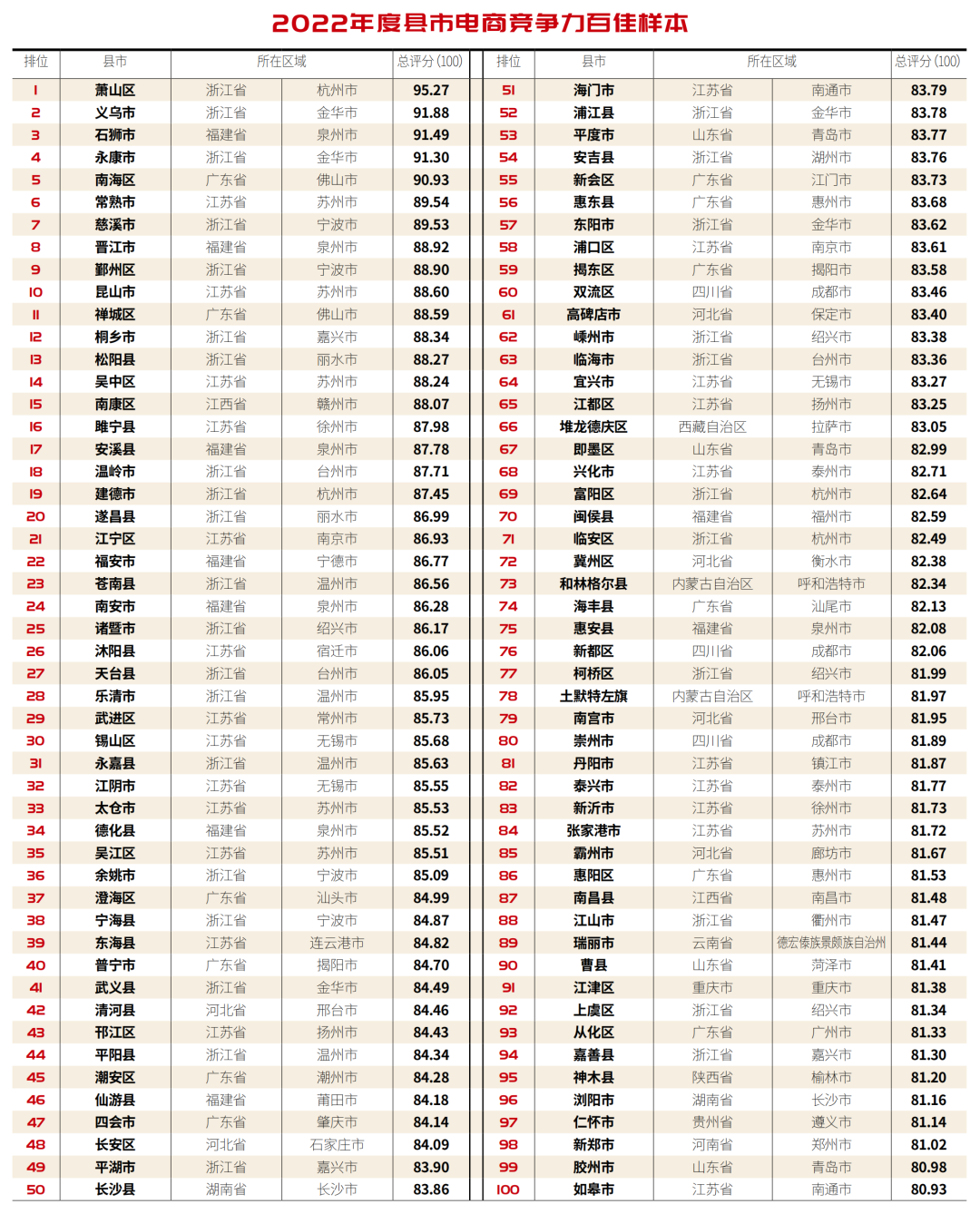 作為數(shù)字經(jīng)濟的一種形態(tài),縣域電商不僅是人們增收致富的重要渠道,也是驅(qū)動地方產(chǎn)業(yè)發(fā)展,甚至盤活整個縣域經(jīng)濟的一把利器。2022年5月,“2022年度縣市電商競爭力百佳樣本”榜單重磅發(fā)布,浙江省杭州市蕭山區(qū)、浙江省金華市義烏市、福建省泉州市石獅市、浙江省金華市永康市、廣東省佛山市南海區(qū)、江蘇省蘇州市常熟市、浙江省寧波市慈溪市、福建省泉州市晉江市、浙江省寧波市鄞州區(qū)、江蘇省蘇州市昆山市位列前十。